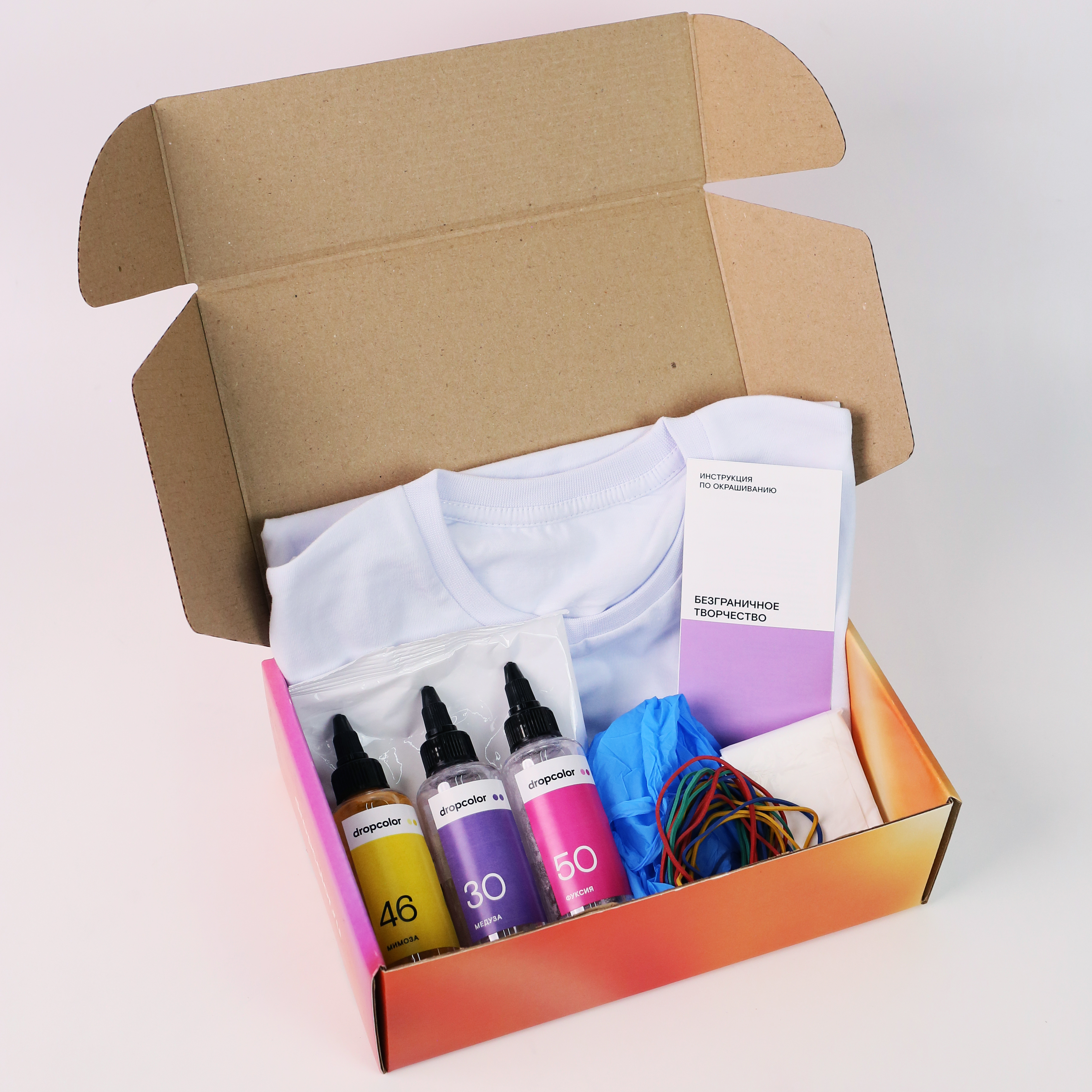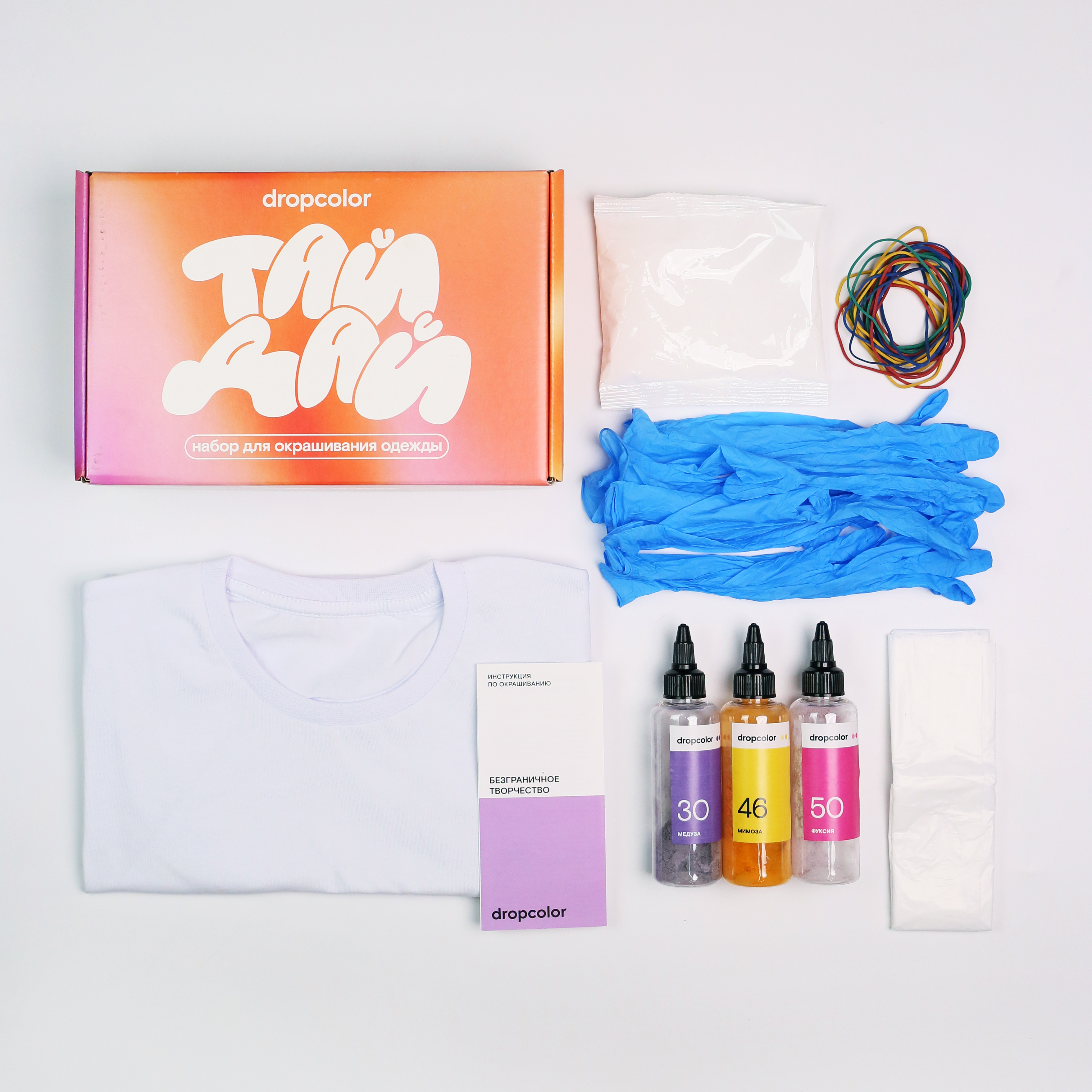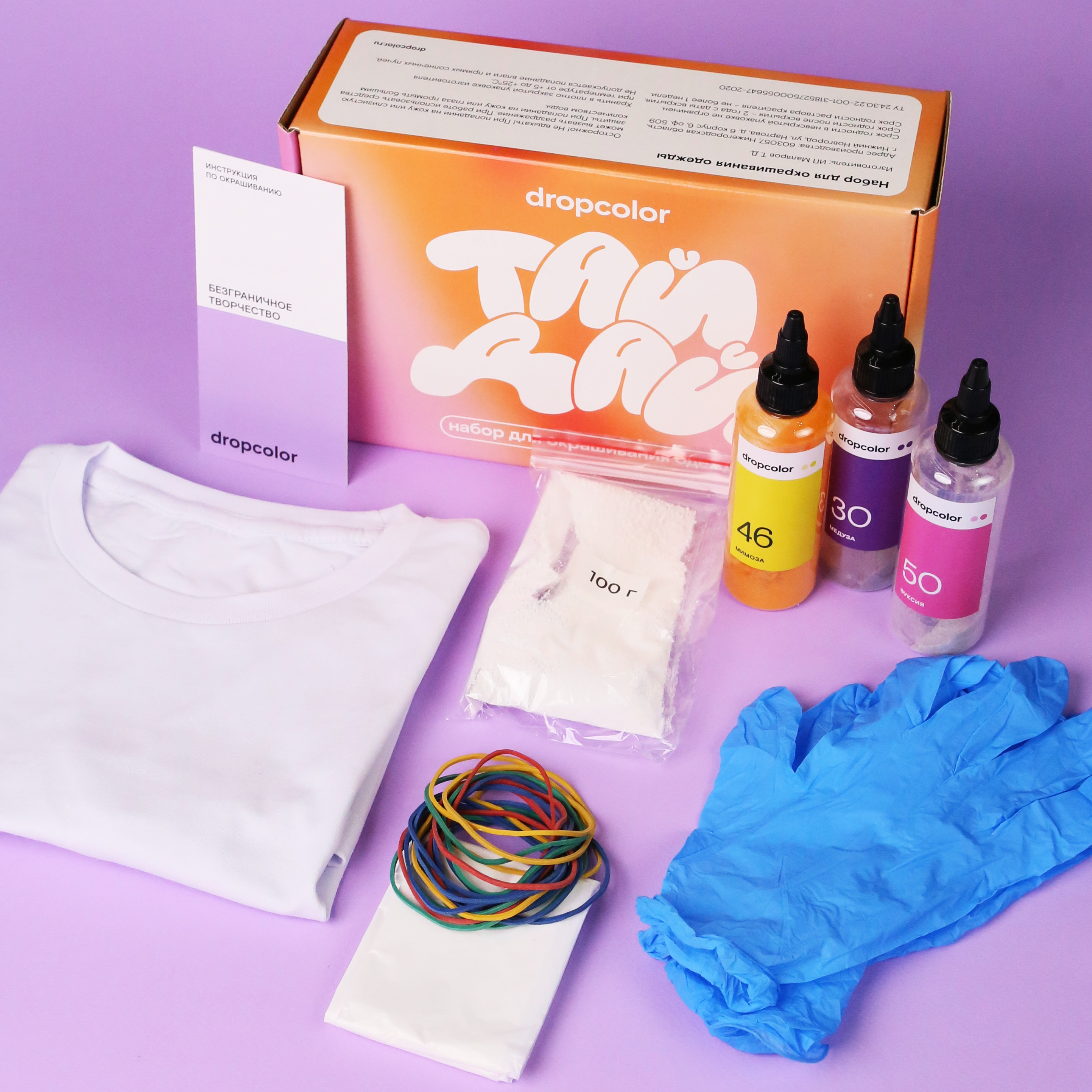 В нём есть всё необходимое для первого опыта в технике тай-дай. Ребёнок сможет создать яркую футболку своими руками — все материалы уже внутри.