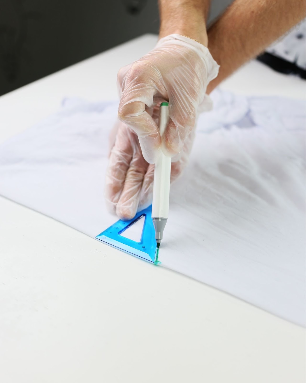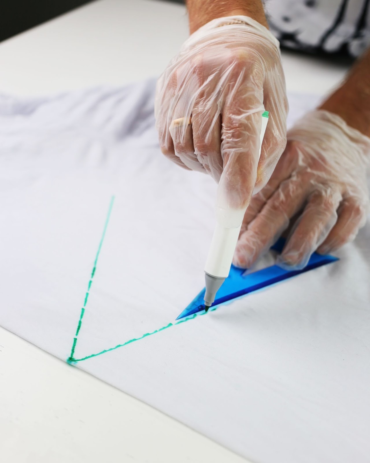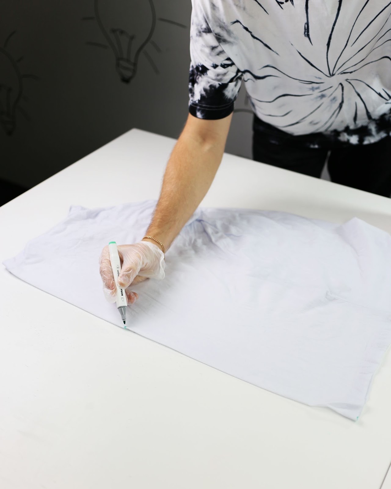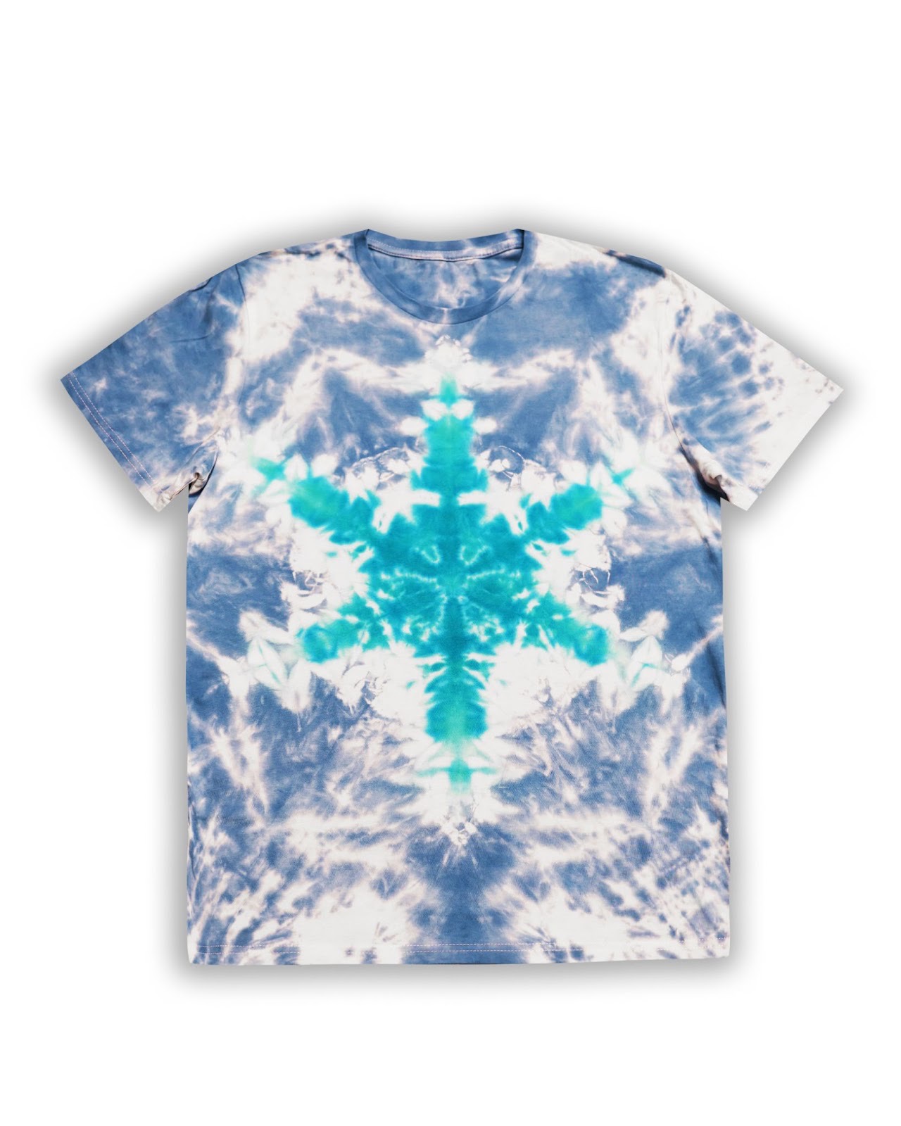Сложи переднюю часть футболки пополам и тщательно разгладь ткань. Определи центр будущей снежинки и отметь его водорастворимым маркером.